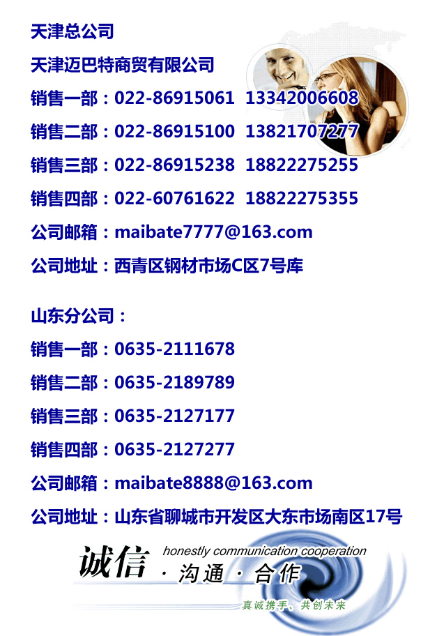 銷售一部:022-86915061 13342006608 銷售二部: 022-86915100 13821707277 銷售三部:022-86915238 18822275255 銷售四部:022-85100234 18822275355 公司地址:西青區(qū)鋼材市場C區(qū)7號(hào)庫